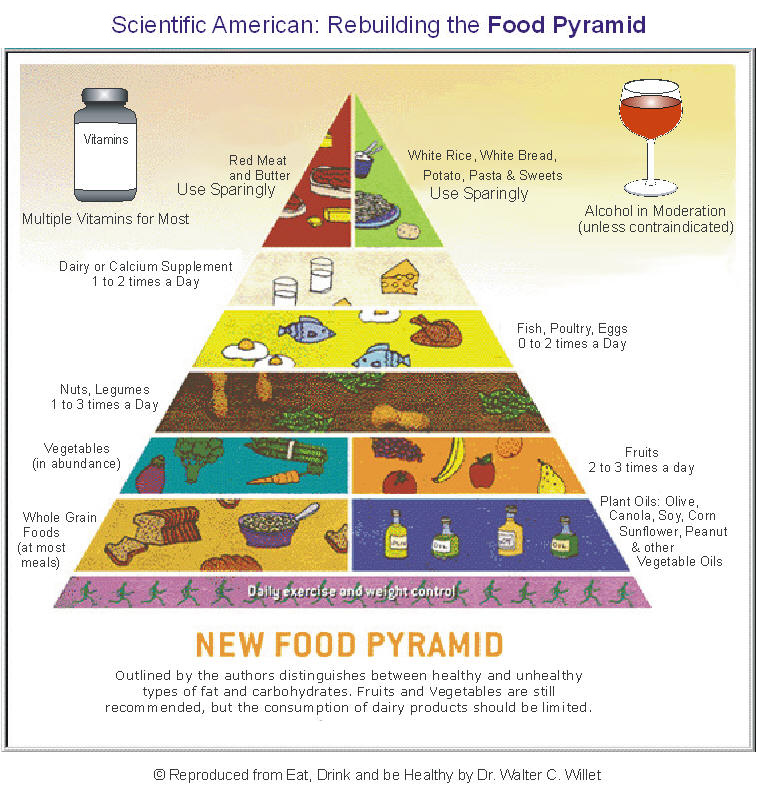 OLD FOOD PYRAMID conceived by the U.S. Department of Agriculture was intended to convey the message "Fat is bad" and its corollary "Carbs are good." These sweeping statements are now being questioned. Not all fats are bad for you, and by no means are all complex carbohydrates good for you. The USDA's Center for Nutrition Policy and Promotion is now reassessing the pyramid. This effort is yet to be completed sometime this year. Since the pyramid was released by the U.S. Department of Agriculture in 1992, nutrition scientists have criticized the content and design and proposed numerous alternatives, including the Healthy Eating Pyramid, California Cuisine Food Pyramid, Mediterranean Diet Pyramid and Soul Food Pyramid. Some experts think the USDA pyramid desperately needs this reassessment. "You can think of the pyramid as a dowdy old lady who never got a new wardrobe," says Alice Lichtenstein, a professor of nutrition at Tufts University in Boston. "She hasn't been updated on the basis of new scientific evidence and new dietary recommendations." "It's severely out of date," says Walter Willett, chairman of the department of nutrition at Harvard School of Public Health. He says the pyramid doesn't reflect the latest research on nutrition and weight control, and it may be contributing to obesity and health problems in this country. Judi Adams, president of the Wheat Foods Council, an industry group that promotes eating grains, agrees that it needs some "tweaking," including emphasizing whole grains more. The government pyramid, created as a tool to teach the U.S. Dietary Guidelines, took on many shapes before it was released. Officials tested images of a plate, a bowl and a shopping cart before choosing the pyramid. "We are looking to make sure the recommendations are consistent with the most recent science, and that it (the pyramid) is better interpreted by the public," says Steven Christensen, acting director of USDA's Center for Nutrition Policy and Promotion. The agency is taking a hard look at the design and messages. The USDA is also reviewing new nutrient recommendations from the National Academies' Institute of Medicine, which include advice on many things from dietary fiber to daily activity. "We are looking to see if the servings in the Food Guide Pyramid meet the new recommendations," says the agency's John Webster.